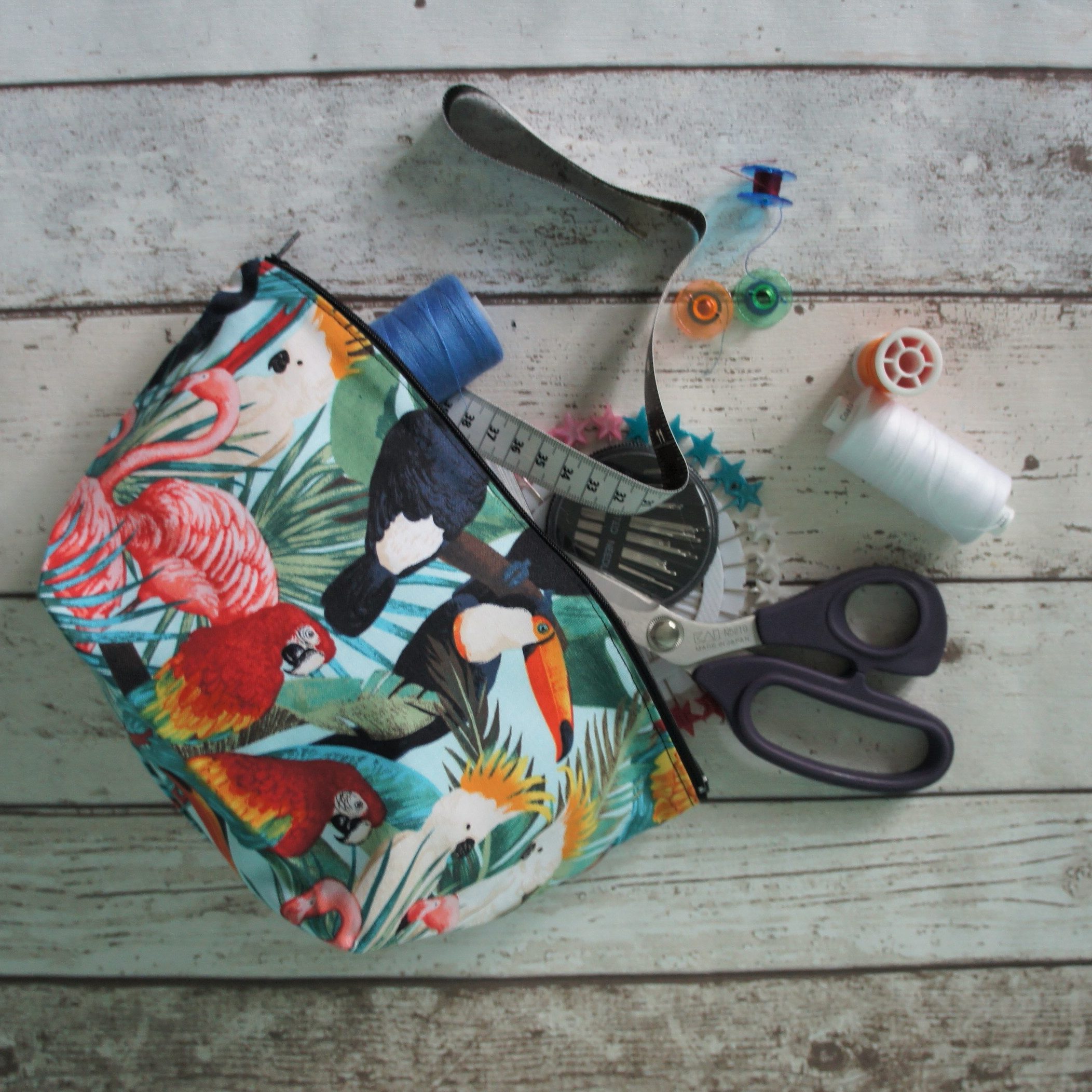 Tropical adventures are to be had within the confines of this bird covered bag. These feathered friends are sure to keep all your goodies safe and make you smile.